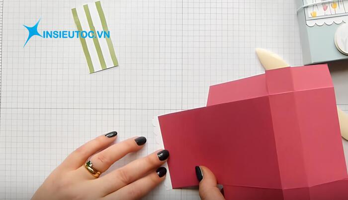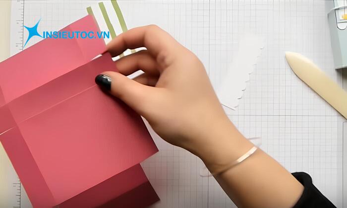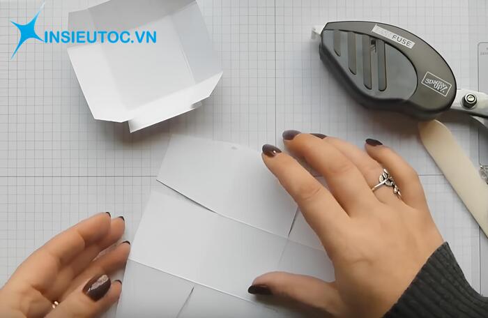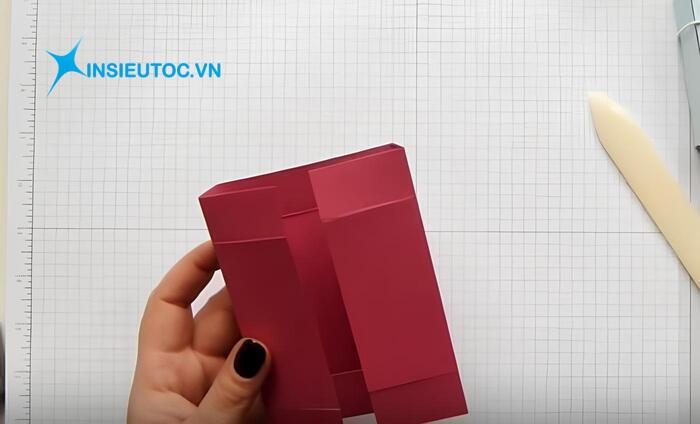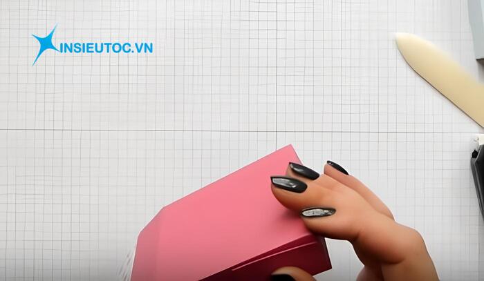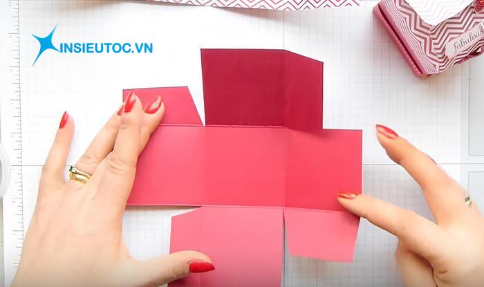 - Bước 2: Bạn dùng thanh phẳng để vuốt phẳng các nếp gấp theo đường vẽ. Gấp lại thành hình hộp, một cánh bạn gấp sẽ làm nắp hộp quà.