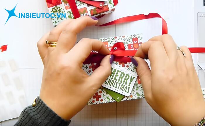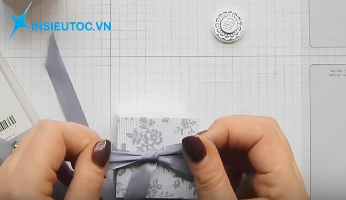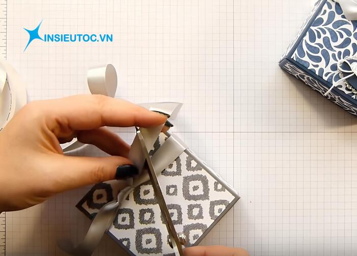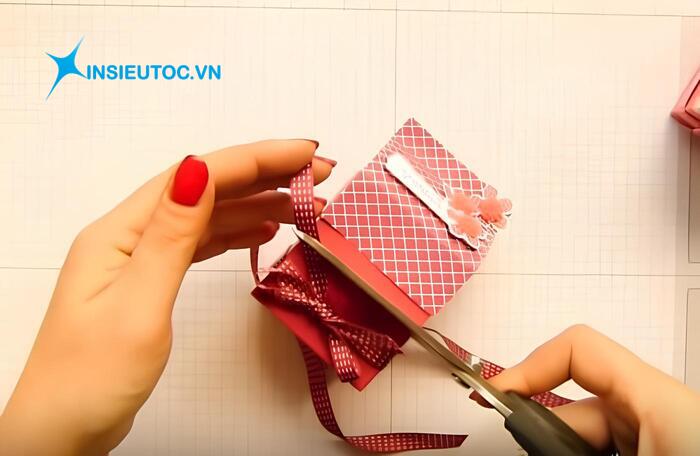 - Bước 6: Bạn trang trí chiếc hộp bằng một sợi ruy băng to bản, quấn quanh hộp và thắt một chiếc nơ cho thật xinh ở mặt trước.