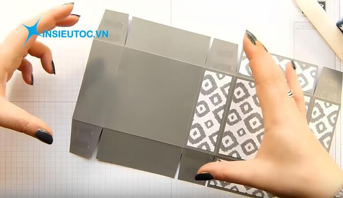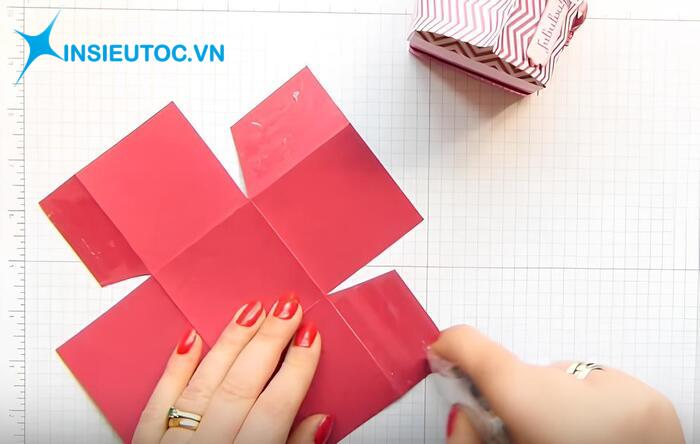 - Bước 6: Bạn bôi keo vào mặt ngoài của 4 hình vuông nhỏ ở 4 góc này rồi lần lượt dán keo vào mặt trong của các cạnh tiếp giáp nhau để tạo thành thân và nắp hộp.