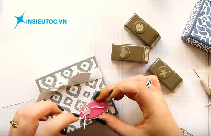 - Bước 9: Trang trí bằng mực in và con dấu trên giấy, sau đó cắt và gắn phụ kiện lên hộp.
