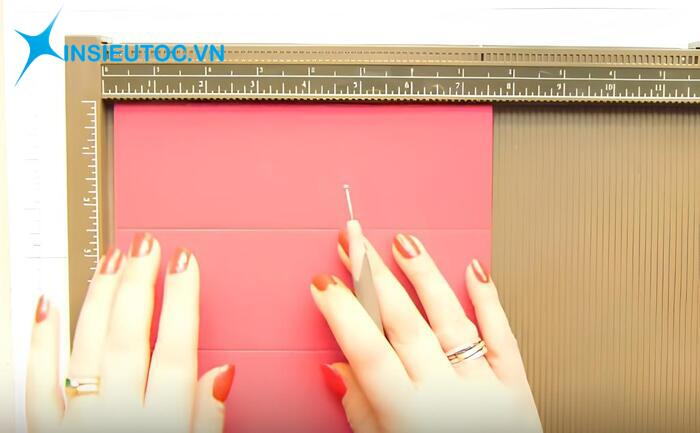 - Bước 1: Lấy một tấm thiệp hình chữ nhật 13x21cm. Sau đó dùng thước đo chiều dài, từ mép trái của tấm thiệp kẻ các đường thẳng theo các kích thước 4,5cm, 6,4cm, 14,6cm, 16,5cm. Tiếp đến là chiều rộng, bạn cũng kẻ đường thẳng từ cạnh trái và được chiều dài lần lượt là 2,54cm và 10,2cm.