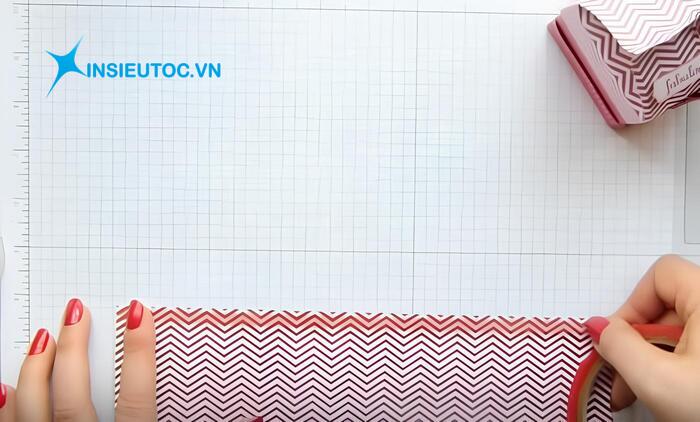 - Bước 3: Bạn cắt một miếng giấy hình chữ nhật sao cho khớp với cạnh hình chữ nhật của nắp hộp, sau đó đóng dấu một cạnh dài của miếng giấy hình chữ nhật có chiều dài bằng với cạnh miếng giấy bạn vừa cắt. Cạnh này sẽ được dập thành đường viền cong theo từng nửa hình tròn như hình bên dưới.