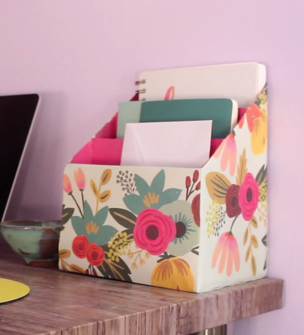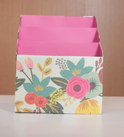 Tuy nhiên, cần chuẩn bị thùng giấy có kích thước lớn hơn, và thay vì đặt chéo các tấm giấy tạo thành 4 ngăn thì bạn đặt tấm giấy song song với nhau và khoảng cách bằng nhau tạo thành 3 ngăn để đựng tài liệu. Trang trí theo ý muốn để hợp không gian văn phòng.