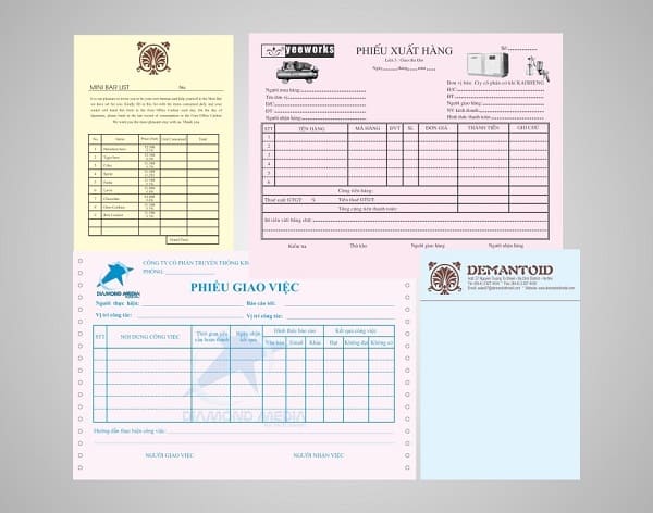Giấy tiêu đề, phiếu thu chi, phiếu tạm ứng, phiếu thanh toán, phiếu nhập kho, phiếu xuất kho, phiếu giao hàng, phiếu bảo hành, hóa đơn bán lẻ,…được xem là những sản phẩm nằm trong in biểu mẫu. Chính vì thế, đây được xem là một hoạt động cũng như một phương tiện rất quan trọng và cần thiết giúp chủ nhân sử dụng có thể giao tiếp nội bộ lẫn giao dịch với khách hàng, đối tác ở bên ngoài.