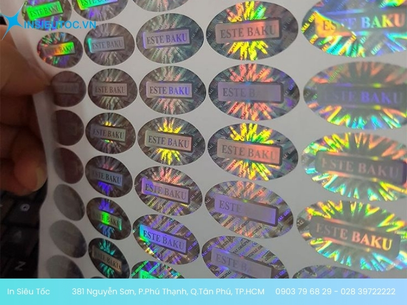 - Ép kim/nhũ: Thêm các hiệu ứng kim loại hoặc nhũ vào tem để làm nổi bật các chi tiết quan trọng như logo hoặc thông tin sản phẩm.