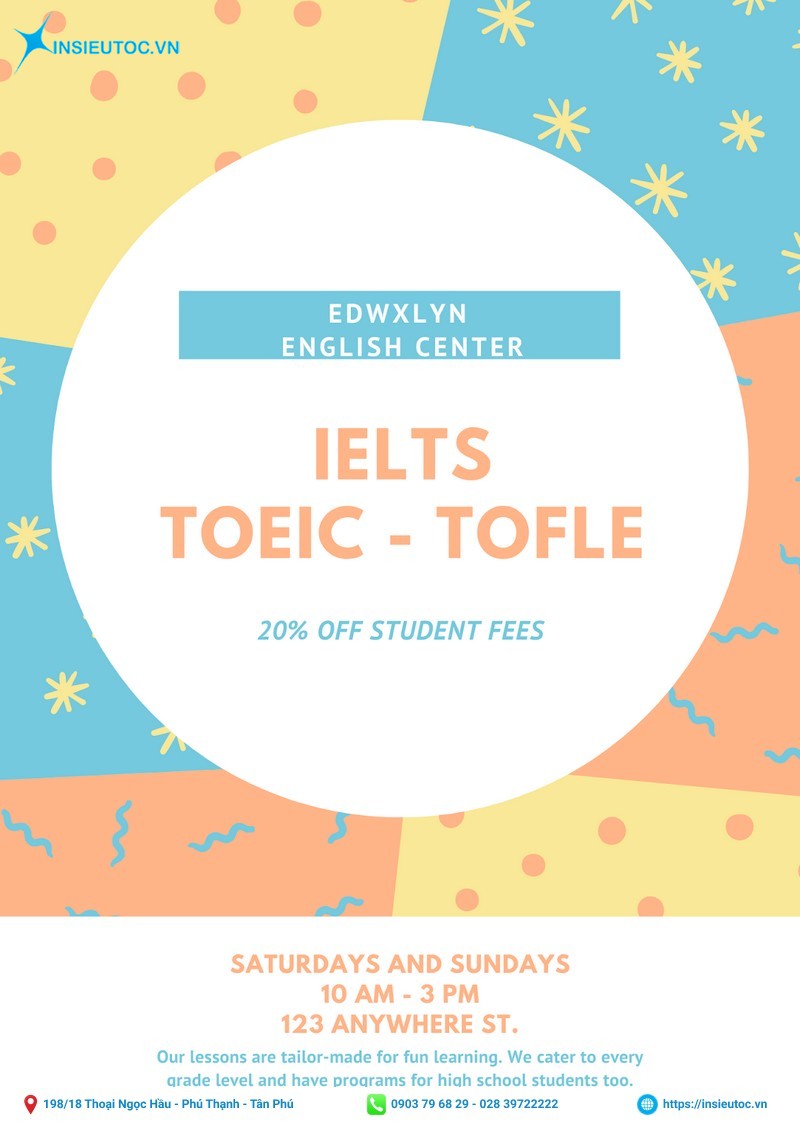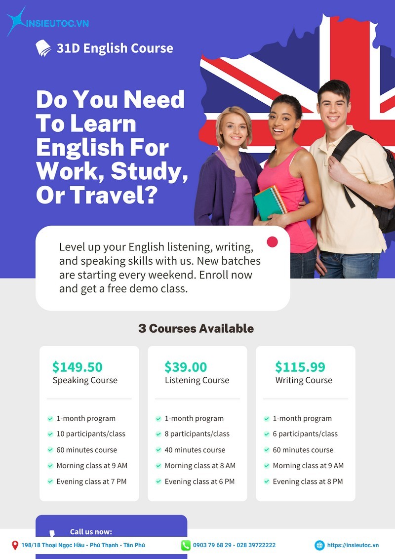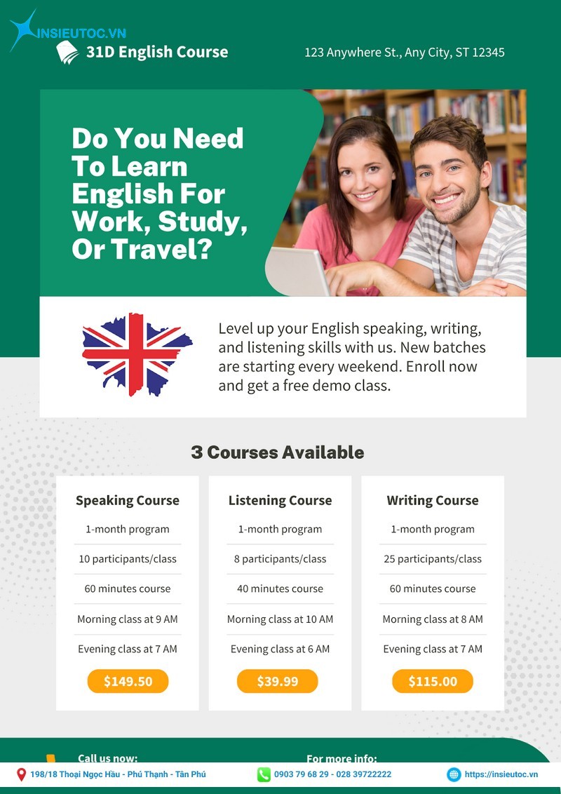 Các thông tin trên tờ rơi trung tâm English cần được thể hiện đầy đủ nhưng ngắn gọn và súc tích nhất. Đảm bảo cho khách hàng có cái nhìn khái quát và đầy đủ nhất.