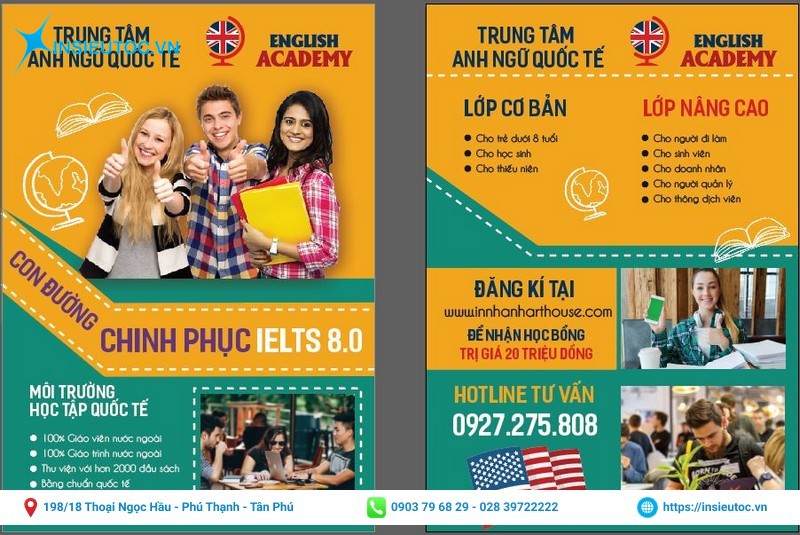 Hiện nay, nhu cầu về việc in ấn tờ rơi trung tâm tiếng Anh rất cao. Bởi cùng với sự ra đời của nhiều trung tâm dạy ngôn nhữ Anh là sự cạnh tranh gay gắt trong thị trường này. Vậy làm sao để có một chiến lược quảng cáo hiệu quả với chi phí thấp? Mời bạn cùng tìm hiểu cách in ấn và thiết kế cùng In Siêu Tốc qua bài viết dưới đây.
