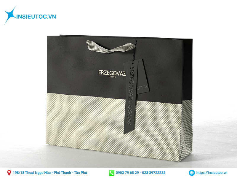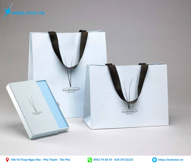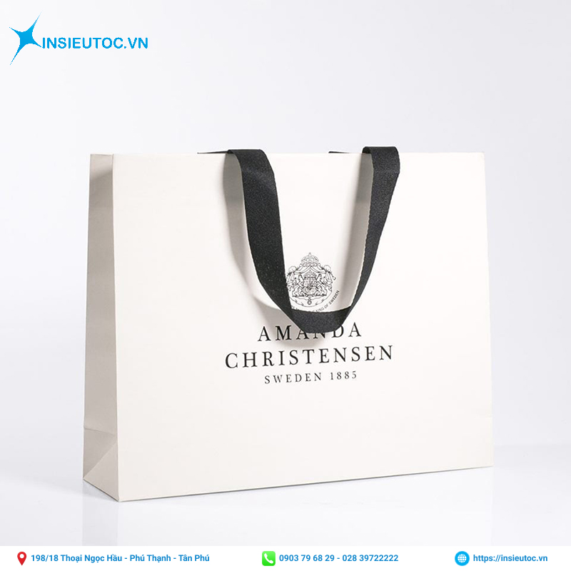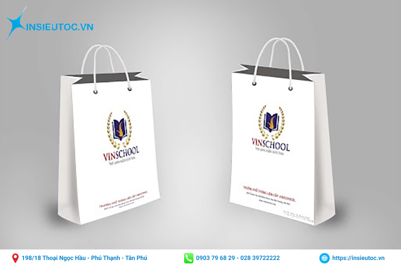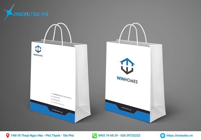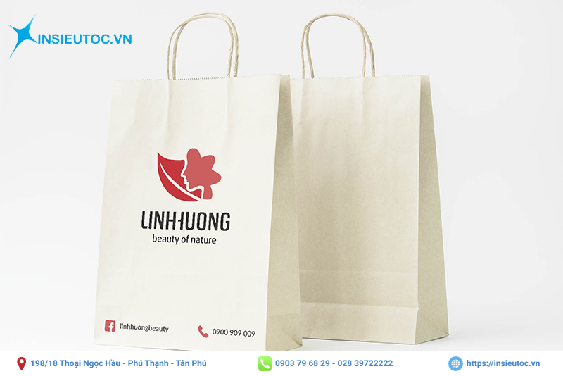 Trên túi giấy có in thông tin doanh nghiệp đầy đủ