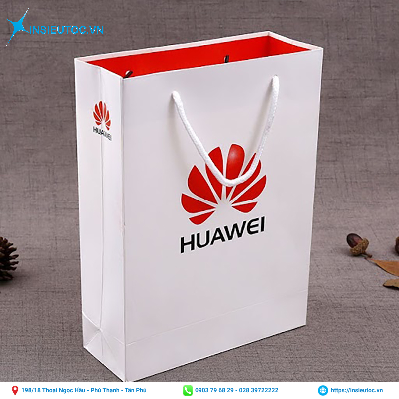 Thiết kế túi giấy của Huawei với màu cam trắng nhận diện thương hiệu