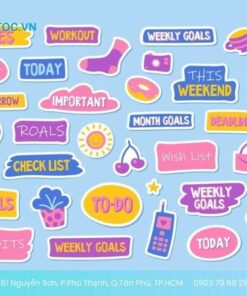 Nhãn dán cute tập trung vào các câu chữ truyền động lực (“Do it”, “Goals”, “Smile”), từ ngữ biểu cảm (“Hi!”, “Why?”) hoặc các biểu tượng chức năng (check list, deadline). Chúng có giá trị truyền tải thông điệp trực tiếp, tạo dựng nhận diện thương hiệu qua slogan, hoặc hỗ trợ việc lập kế hoạch, ghi chú.