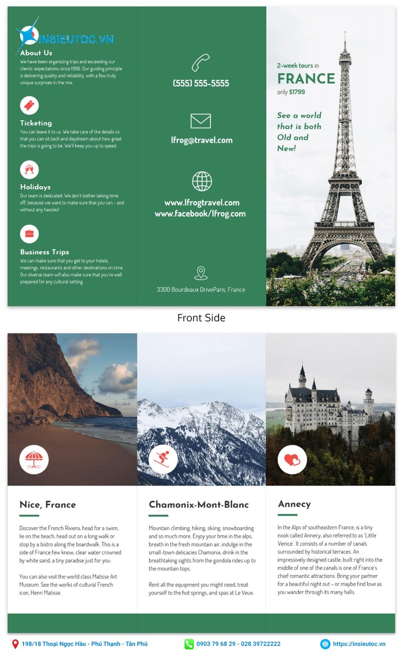 Tờ rơi du lịch nên cung cấp đầy đủ thông tin về địa điểm, lịch trình, dịch vụ, giá cả, hình ảnh và liên hệ để khách hàng dễ dàng nắm bắt.