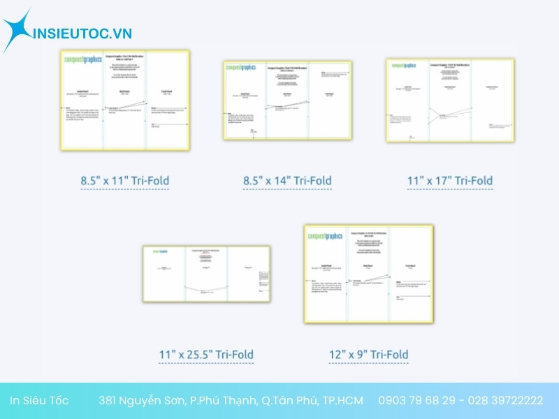 - Tờ rơi gấp 3 kích thước 17 x 11 inch (43.18 x 27.94 cm), khi gấp lại là 5.6875 x 11 inch (14.45 x 27.94 cm)