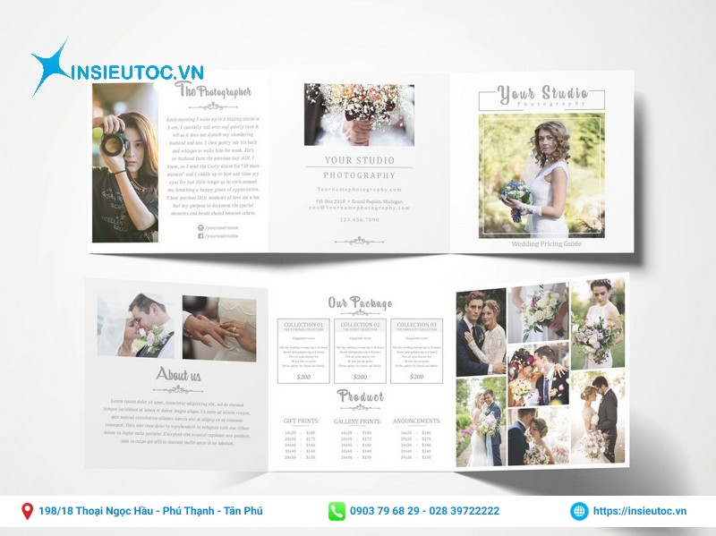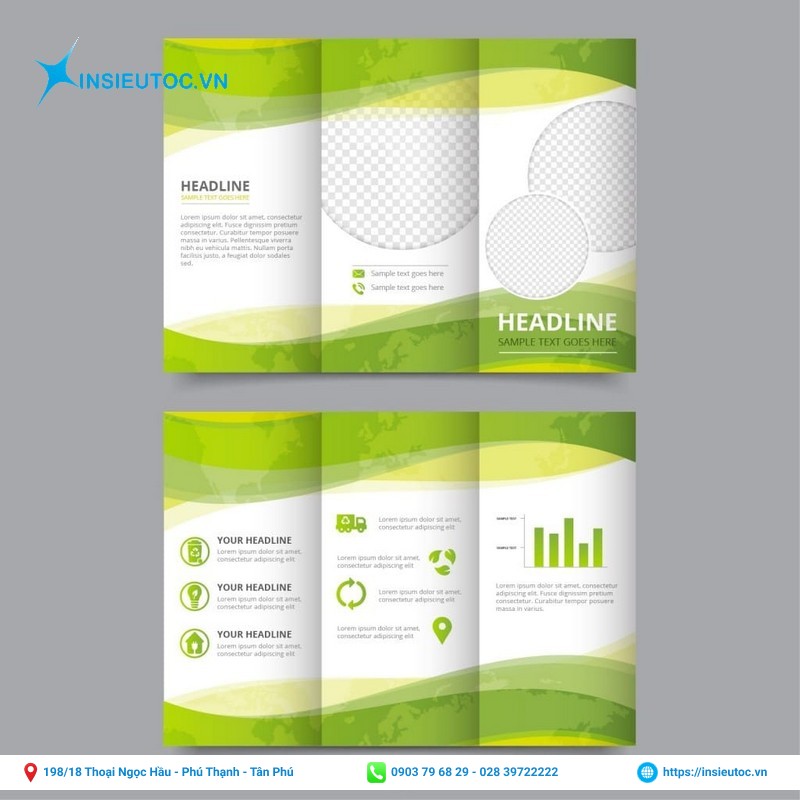 Đây là mẫu tờ rơi gấp 3 thường gặp nhất, gồm có 6 trang được gấp 2 lần trên phần giữa giúp bạn có nhiều không gian để nói về sản phẩm, doanh nghiệp và thương hiệu của mình.