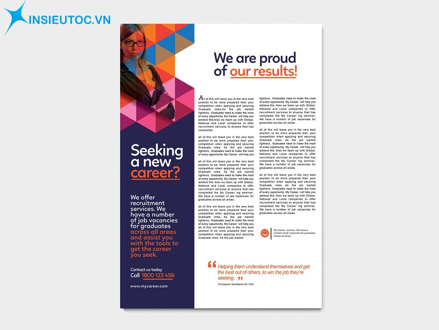 Tờ rơi tuyển dụng là công cụ quảng cáo thông qua tờ rơi được in ấn để thông báo về nhu cầu tuyển dụng nhân sự của một công ty. Với thiết kế nổi bật, nội dung rõ ràng, tờ rơi cung cấp thông tin tuyển dụng cụ thể, lợi ích công việc và hướng dẫn ứng tuyển chi tiết. Đặc biệt, chi phí thấp và khả năng phân phối linh hoạt giúp doanh nghiệp tiếp cận nhiều đối tượng tiềm năng trong thời gian ngắn. In Siêu Tốc cung cấp dịch vụ in tờ rơi tuyển dụng với mức giá dao động từ 630.000đ tùy vào số lượng và kích thước khác nhau, với kỹ thuật in offset, in kỹ thuật số hiện đại.